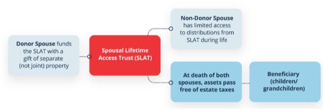 - Tax-Free Transfer: Upon the spouse's death, any remaining assets in the trust are transferred to the remaining trust beneficiaries free from estate taxes, making a SLAT an attractive tool for estate planning purposes.